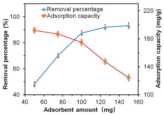 To investigate the influence of the adsorbent amount on the adsorption properties of the GO-CNT/AC composites, different amounts of composites were placed in 100 mL of MB solutions with a concentration of 200 mg/L for the adsorption test, the pH value of 7, absorption time of 300 min, CNT concentration of 3 mg/mL, and adsorbent amounts of 50, 75, 100, 125 and 150 mg respectively were adopted. The removal percentage and adsorption capacity of the samples were calculated subsequently, as shown in Figure 8. When the adsorbent amount increases from 50 mg to 150 mg, the removal percentage increases from 48.03% to 93.16%; the adsorption capacity decreases from 192.12 mg/g to 124.21 mg/g. The reason is that when the adsorbent amount increases, the total surface area provided by the composite increases, and the total amount of active adsorption sites also increases significantly. Hence, more MB molecules can be adsorbed from the solution, resulting in an obvious increase in the removal percentage. On the other hand, as shown in Formula (2), the adsorption capacity was defined as the ratio of the total amount of adsorbed MB molecules to the adsorbent mass. When the adsorbent amount increases from 50 mg to 150 mg, although more MB molecules are adsorbed, the increasing amount of the adsorbent is lager, which leads to a decrease in the adsorption capacity with increasing adsorbent amount.