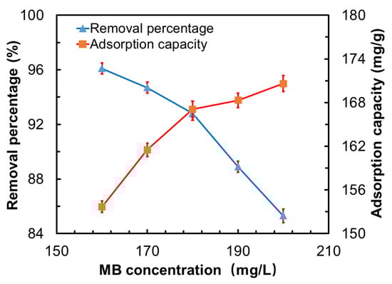 To investigate the influence of the MB concentration on the adsorption properties of the GO-CNT/AC composites, 100 mg of composite was placed in 100 mL of MB solutions with different initial concentrations (160–200 mg/L) for the adsorption test, the pH value of 7, absorption time of 300 min, and CNT concentration of 3 mg/mL were adopted, and the results are shown in Figure 9. When the initial MB concentration increases from 160 mg/g to 240 mg/g, the removal percentage of the composites decreases from 96.1% to 85.3%, and the adsorption capacity increases from 153.7 mg/g to 170.6 mg/g. The reason is that when the initial MB concentration increases, the number of MB molecules near the surface of the absorbent increases significantly, and the surface active sites of GO-CNT/AC composites are more fully surrounded by dye molecules, hence, more dye molecules are captured and absorbed by the composites, which leads to the increasing of the adsorption capacity [35,36]. However, as an adsorbent relying on micropores and electrostatic adsorption sites, GO-CNT/AC composite has a limited adsorption capacity. When the saturated adsorption state is reached, the removal percentage will decrease if the initial MB concentration continues to increase.