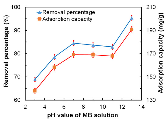 To evaluate the influence of the pH value on the adsorption performance of the GO-CNT/AC composites, 100 mg of GO-CNT/AC composites was placed in 100 mL of MB solutions with a concentration of 200 mg/L, absorption time of 300 min, CNT concentration of 3 mg/mL, and pH values of 3, 5, 7, 9, 11, and 13, respectively. The removal percentage and adsorption capacity were calculated, which are shown in Figure 10. With the increasing pH value, both the removal percentage and the adsorption capacity of the composites show an increasing trend. When the pH value increases from 3 to 13, the removal percentage increases from 68.9% to 95.4%, and the adsorption capacity increases from 137.9 mg/g to 190.8 mg/g. In this process, the removal percentage and the adsorption capacity of GO-CNT/AC composites are increased by 38.5% and 39.6%, respectively, indicating that the pH value of the MB solution has a significant impact on the adsorption performance of the composites. This is because that as a cationic dye, MB molecules are positively charged in the solution. When the pH value of the solution is less than 7, there are a large number of positively charged H+ ions in the acidic system. These H+ ions adsorb on the surface of the absorbent and generate electrostatic repulsion with MB molecules [37,38,39], thus restraining the diffusion and adsorption of MB molecules on the surface of the absorbent, and ultimately reducing the adsorption capacity of the composites. When the pH is higher than 7, there are a large number of OH- ions in the solution, which adsorb on the surface of the absorbent and further combine with MB molecules through the electrostatic attraction effect [38,39]. This is conducive to the diffusion and adsorption of MB molecules on the surface of the composite, and also promotes MB molecules to enter the microporous structure of the composite, further improving the adsorption effect of the composites. Finally, the adsorption capacity of the GO-CNT/AC composite was significantly increased. However, it can be found that with the increasing pH value, the adsorption capacity of the composites has a slightly downward trend when the pH value is between 7 and 11. This is because the generation of hydrophilic functional groups on the CNT surface, which weakens the stable link between AC and GO, leads to partial disintegration of the composites. Therefore, the electrostatic adsorption sites on the surface of GO-CNT/AC composites decrease, which causes a decreasing adsorption capacity. However, when the alkalinity is further enhanced to strong alkalinity (such as pH = 13), a large number of OH- ions are ionized, and the remaining AC, CNTs, and GO can generate more electrostatic adsorption sites, which promotes the adsorption process. Therefore, the adsorption properties of the composites are further improved at this time.