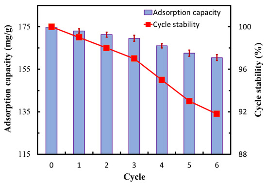 To investigate the cyclic adsorption properties of the GO-CNT/AC composites, six cycles of adsorption–desorption tests were conducted. The adsorbent amount of 100 mg, MB solution amount of 100 mL, MB solution concentration of 200 mg/L, pH value of 7, adsorption time of 300 min, and CNT concentration of 3 mg/mL were applied. The adsorption capacity after each cycle was measured, as shown in Figure 11. The adsorption capacity of the GO-CNT/AC composites for MB in the initial cycle is 174.8 mg/g. After six cycles, the adsorption capacity is 160.5 mg/g, with a cycle stability (Cs = Qt/Q1) of 91.8%. The high stability of the adsorption–desorption cycle of the composites reveals that the addition of CNTs creates a stable link between the AC and GO sheets. During the adsorption–desorption cycle, the fluffy structure created by CNTs is easier to adsorb and desorb dye molecules. In the last two cycles, the loss rate of the cycle stability is slightly higher because the desorption process requires acid treatment. Thus, the original stable link in the GO-CNT/AC composite is destroyed, which causes the gradual disintegration of GO-CNT/AC composite, reducing the cycle stability of the system. However, even after six cycles of testing, the adsorption capacity of the composites is still high, indicating that the GO-CNT/AC composites still maintain structural integrity, the GO and CNTs are still stably linked with AC. Thus, the addition of CNTs can improve both the adsorption capacity and the cycle stability of the GO-CNT/AC composites.