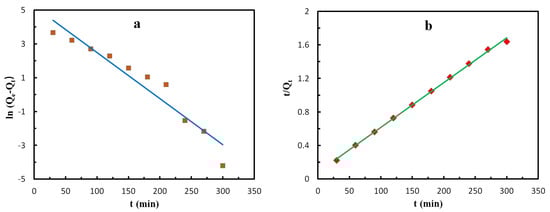 Fitting plots of the PFO (a) and PSO (b) models in the MB adsorption process.