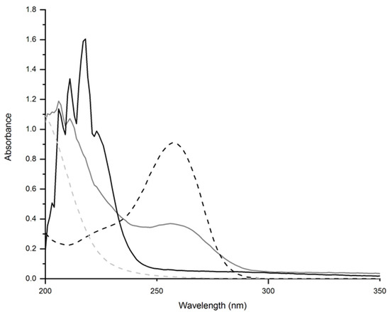 UV-Vis spectra of CS (solid black line), modified CS (grey line), pyrrole carboxylic acid (black dashed) and methacrylic acid (grey dashed).