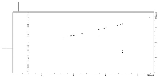 Solution state 1H NMR spectra for the CS starting material and the modified CS derivative in DCl/D2O are shown in Figure 3. The small peak at around 2.03 ppm is ascribed to the methyl group (-CH3) attached to the N-alkylated GlcN residue. At 3.10 ppm a singlet represents H2, multiplet signals from 3.5 to 4 ppm are assigned to H3, H4, H5 and H6 of GlN. From the literature, typically the spectra would show a small peak around 4.28 ppm due to H1 of both GlN and the acetylated form [83,84]. Comparison of the peak integrals from H2-H6 (~3 to 4 ppm) which represent 6 protons to the integral of the peak at 2.03 ppm which represents 3 protons enables estimation of the degree of acetylation of the CS (the partially deacetylated derivative of chitin) which was ca. 12% in this study, i.e., the unmodified CS used is around 88% deacetylated (similar to the supplier’s estimate of 75–85% deacetylation). The spectra for modified CS shows new chemical shifts corresponding to the new functional groups installed. The peak at 1.9 ppm is characteristic of the methyl group attached to the methacrylate (confirmed by the NMR spectra of methacrylic acid showing a peak at 1.9 ppm). Signals from ~5 to 6.5 ppm are assigned to the two protons connected to the double bond. A multiplet of peaks with low intensity can be seen between 7.9 and 8.1 ppm which are ascribed to pyrrole attached to the backbone of CS (albeit very difficult to integrate in comparison to methacrylate moieties). Two-dimensional 1H—1H COSY NMR links methacrylate olefins (5.5–6 ppm) to the methyl at 1.9 ppm (Figure 4).