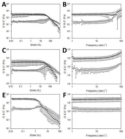 The rheological properties of the hydrogels were characterized by both dynamic strain sweep testing (performed at a constant frequency of 1Hz (10 rad/s)) and frequency sweep testing (performed at 0.5% strain for non-conductive hydrogels and at 0.1% for conductive hydrogels) to assess the storage modulus (G′—elastic) and loss modulus (G″—viscous) of the hydrogels (Table 2 and Figure 6). When G′ is higher than G″ it suggests that the gel is highly structured and the material behaves in a solid-like fashion; the point where both moduli intersect signifies the breaking point of the hydrogels and is known as the critical strain level or gel point; as strain increases past the critical strain level, the network bonds start to break and the moduli both start to decline (when G′ drops below G″ the gel is more liquid-like) [106]. The properties for the non-conductive and conductive gels are summarized in Table 2.
