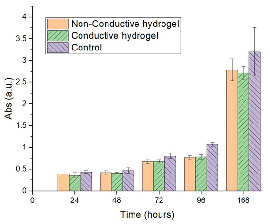 In vitro studies to assess the adhesion and proliferation of NIH3T3 fibroblasts on the hydrogels were conducted, using the standard 3-(4,5-dimethylthiazol-2-yl)-2,5-diphenyltetrazolium bromide (MTT) assay was used to study cell adhesion and proliferation over the period of one week compared to the cells on tissue culture plastic, assessed at 1, 2, 3, 4 and 7 days. NIH3T3 fibroblasts adhered and proliferated on the non-conductive and conductive gels (no discernable differences between the data for the types of gel), albeit slightly less effectively on the gels than on the tissue culture plastic control (Figure 7).