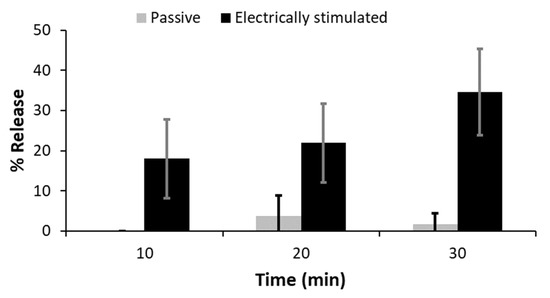 Passive release of the drug was carried out by placing the electrodes with hydrogels in 4 mL PBS and 10 μL samples were taken every 11 min in line with the sampling frequency for the samples that were electrically stimulated.