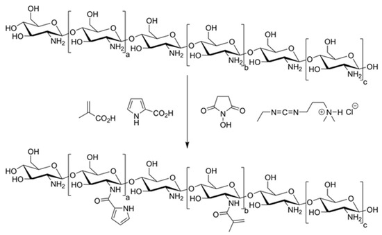 Chemical modification of CS (conjugation of methacrylate and pyrrole moieties via EDC/NHS chemistry).