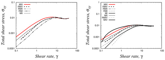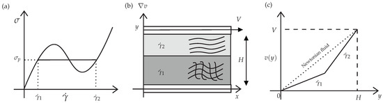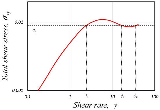 The non-monotonic curve shown in Figure 1a, which is the theoretical curve predicted by many constitutive equations, has interesting features: (1) in the banded region (), a negative slope for the flow curve vs. is seen, and homogeneous flow is unstable there, triggering the formation of bands with different shear rate values, and (2) a multivalued region (i.e., three different possible values of shear rate for a given value of shear stress). However, experiments have observed that real systems have well-defined stress, which is the stress plateau . Thus, the real shear flow curve is composed of two increasing stable homogeneous curves of high and low viscosities separated by a stress plateau (horizontal line) extending between two shear rate values and .