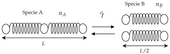 Visual representation of the process of breakage and reformation of the micellar chains modelled by the VCM model: the specie A (long chains) can break to form short chains (specie B), which can themselves recombine to form a long chain (specie A). The chains undergo rupture at a rate dependent on the local elongation and deformation rate .