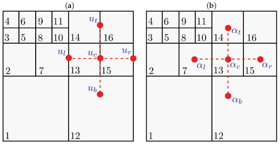 It can be easily noticed from Equation (44) and Figure 4 that does not coincide with some of the mesh grid points (recalling that the component of the velocities is evaluated at the facets centres). Thus, has to be approximated by some interpolation of the grid unknowns in the vicinity of . This interpolation can be carried out as follows: