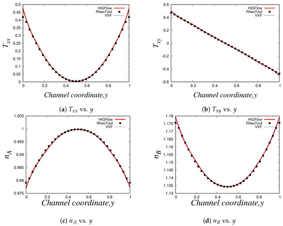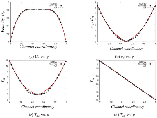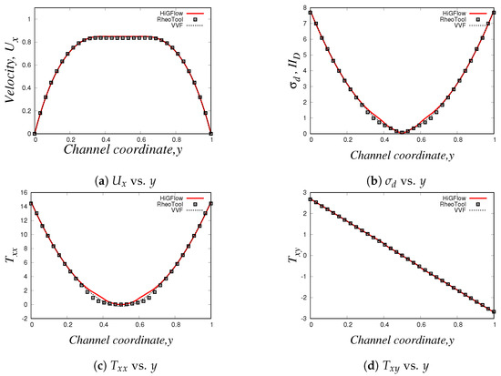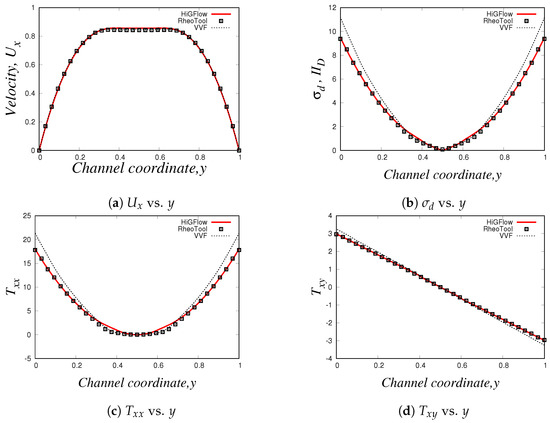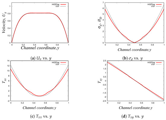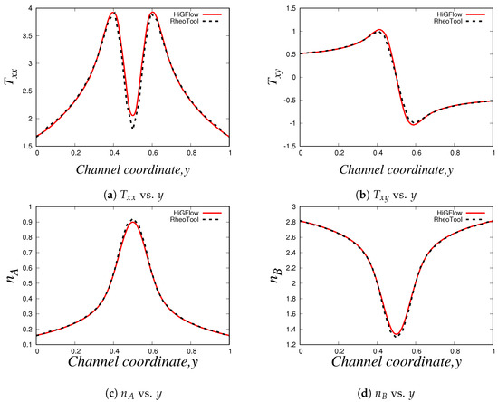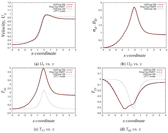 For the last simulation, we use the following parameter values for our LPTT-Bingham fluid: , , , , and . Our results can be found in Figure 32. In these profiles (with the exception of the profile for ), we have also included numerical results carried out in HiGFlow using a standard LPTT model (without yield stress) for reference in order to illustrate how the solutions from the LPTT-Bingham model deviate from the standard viscoelastic model.