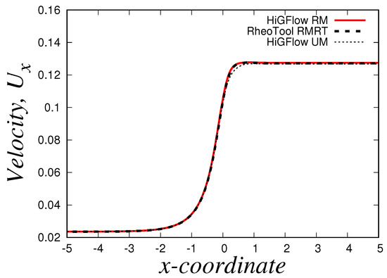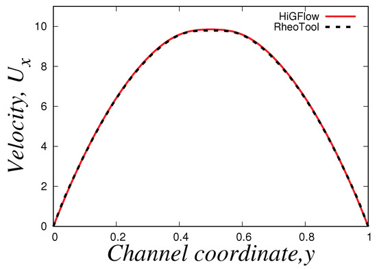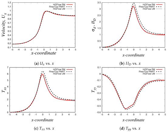 For the Oldroyd-B-Herschel-Bulkley fluid, we use the following parameter values: , , , , and . The centreline axial profiles near the contraction region ( and ) for this case can be found in Figure 30. Overall, it can be seen that both HiGFlow and RheoTool predict the same phenomena, and the curves of the numerical results are almost roughly the same, with some small differences in the numerical values seen in the contraction region ().