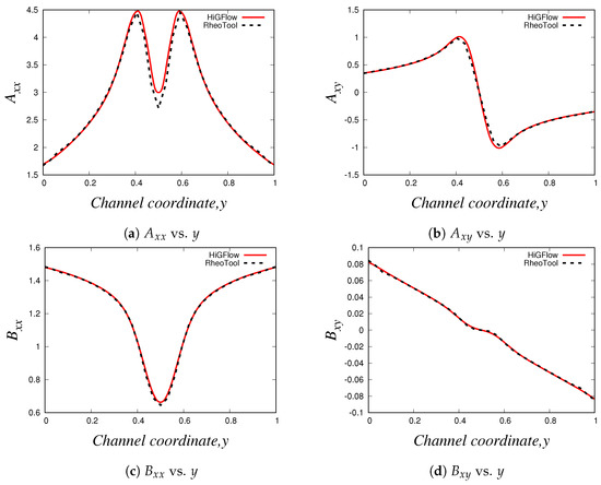 In order to overcome the numerical instabilities seen at high Deborah number values, Equation (38) can be reformulated and be written as a function of the conformation tensor by using the decomposition of the velocity gradient proposed by Fattal et al. [30,31], , where and are anti-symmetric tensors, and is symmetric and commutes with . As a result, Equation (38) becomes: