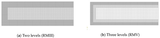 Recently, F.S. Sousa et al. [25] proposed a new approach to discretise the governing equations of fluids, where they introduced a finite difference method with meshless interpolations in tree-based hierarchical grids. These Cartesian grids bring the flexibility and accuracy of local mesh refinement and allow for the development of finite difference or finite volume methods without the hassle of mapping and transforming distorted elements or dealing with general and complicated stencils, as happens in non-Cartesian grids. As discussed in [25], one of the main challenges is to adapt the discretisation stencil near the interfaces between grid elements of different sizes, which is usually solved by local high-order geometrical interpolations. These interpolations, however, depend on the distribution of cells in the vicinity of the point of interest. Hence they are site-specific and can become challenging to calculate in three-dimensional simulations, especially when dealing with staggering arrangements (where some scalar variables are stored in cell centres, whereas the velocities are located at the cell facets). Most methods tend to avoid this by limiting the mesh configuration (usually to graded quadtree/octree grids), thus, reducing the number of cases to be treated locally. The interpolations used in their numerical method are based on Moving Least Squares (MLS) approximations performed to compute the final finite difference stencil weights, allowing for complex mesh configurations while still keeping the overall order of accuracy of the resulting method. This numerical method has already been tested in different flow configurations, and the results were compared with already published methods [25,26,27], showing excellent accuracy and flexibility of this new methodology.