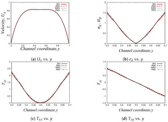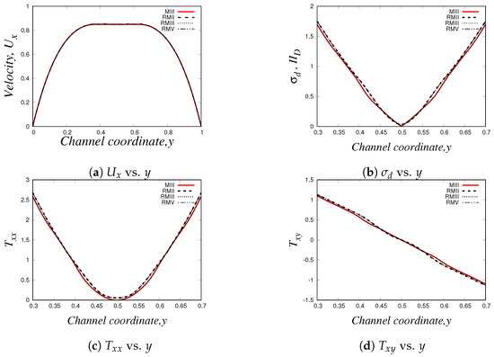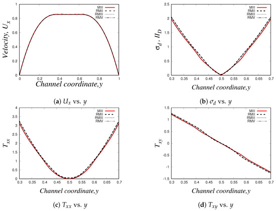 On the other hand, we show the normal components of the elastic stress tensor, which are illustrated in Figure 30c,d. These curves are also in agreement with our previous figure, since we observe that the elastic stresses start to become more relevant when the fluid approaches the contraction region ().