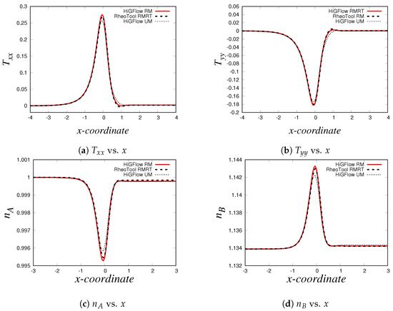 Planar–contraction 4:1 centreline axial profiles of the normal components of the elastic stress tensor ( and ) and the density numbers of the two species ( and ) of a VCM fluid. The results obtained in HiGFlow are the red solid line (refined mesh RM) and the dotted line (uniform mesh UM), while the predictions by RheoTool are represented by the dashed line curve (mesh RMRT).