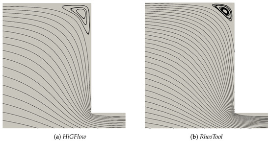 As reported in the literature, the elastic forces in viscoelastic fluids can generate the formation of a corner vortex near the contraction region [34,42]. Therefore, we wish to show the streamlines obtained both in RheoTool and HiGFlow near the contraction region, which can be found in Figure 29. All these streamlines were calculated in Paraview, and we used exactly the same resolution parameters. It can be clearly seen that both methodologies (FVM in RheoTool and finite-differences in tree-based grids in HiGFlow) are able to predict the formation of a corner vortex. However, we can notice that the size of the vortexes differ from each other; for instance, the value of the dimensionless vortex size (horizontal lentgh) predicted by HiGFlow is , while RheoTool predicts a value of , showing a percentage difference between the values.