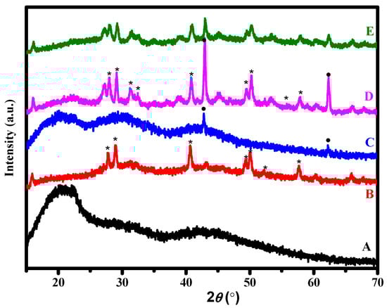 XRD patterns of different ratios of nanoparticles added to CA; (*: Sm2O3 and ●: MgO); (A) CA, (B) Sm2O3@CA, (C) MgO@CA, (D) Sm2O3/MgO@CA, and (E) Sm2O3/MgO/GO@CA.