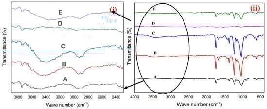 FTIR of CA with different additives of nanoparticles; (A) CA, (B) Sm2O3@CA, (C) MgO@CA, (D) Sm2O3/MgO@CA, and (E) Sm2O3/MgO/GO@CA. (i) FTIR spectra of the range 2400–4000 cm−1, while (ii) represents the whole spectra from 400–4000 cm−1.