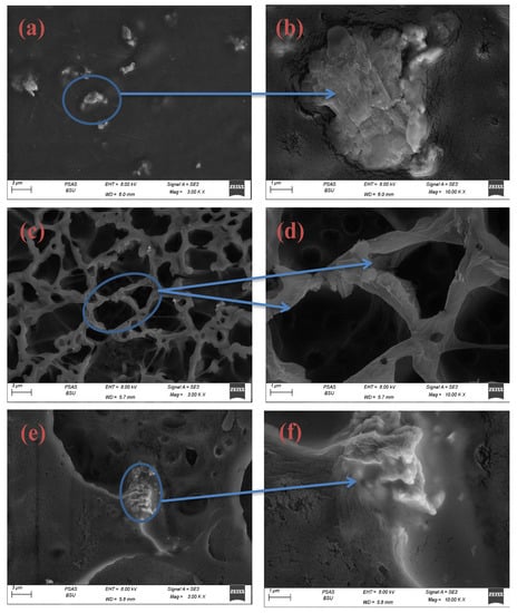 SEM micrograms of CA film casting: (a,b) Sm2O3@CA (c,d) Sm2O3/MgO@CA, (e,f) Sm2O3/MgO/GO@CA.