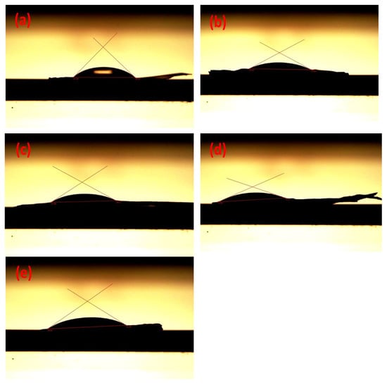 The contact angle of CA with different additives of metal oxides: (a) CA, (b) Sm2O3@CA, (c) MgO@CA, (d) Sm2O3/MgO@CA, (e) Sm2O3/MgO/GO@CA.