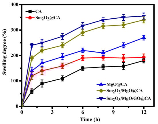 The ability of the scaffold to interact with the injury solutions is essential to keep the moisture of the wound and to avoid dehydration. As well, inhibition of inflammation might be achieved by controlling the solution path through the scaffolds that cover the wound area. In this regard, the swelling degree of the scaffolds has been carried out, as illustrated in Figure 6. As may be seen, the ability to adsorb water increased with the additional nanoparticles of Sm2O3 and MgO. The pure CA started its plateau after around 6 h of soaking with a degree of 150 ± 8%. Furthermore, the highest swelling degree was obtained with the scaffold containing Sm2O3/MgO/GO@CA with a degree of 340 ± 12% after 12 h of socking. The boosting in the swelling degree with the nanoparticle’s modification might reflect the ability of these additives to manipulate the topographical features of the scaffold. Hence, controlling the additional nanoparticles through the scaffolds leads to a high adjustment of the surface roughness and, thus, good controlling of the wettability and swallowability. The biodegradation of these scaffolds through the biological environment also might be controlled via surface modification. Consequently, it is noticed that structural and morphological features are good tools to control the scaffold’s response toward the biological milieu.