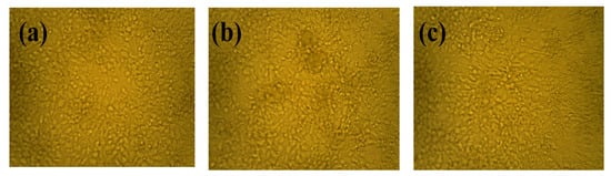 The cell viability test is used to examine the viability of cells and indicates the biocompatibility of scaffolds within normal cells. As obvious in Figure 7a–c, the images of viable cells taken by the optical microscope depict a minority of spherical cells that represent the dead cells, while most of the oval cells represent the viable cells. On the other hand, the concentration of viable cells is shown in Figure 8 after culturing the scaffold for 72 h. The concentration of Sm2O3/MgO/GO@CA started from 7500 µg/ mL. In addition, the IC50 is obtained at 6 mg/mL, which has the ability to degenerate the viable cells with a concentration of 50%. After the addition of nanoparticles to CA, the concentration was determined at 20 mg/mL, and the cell growth reached around 106%. As a result, there is a reversible relation between cell growth and component concentration. The additional components of nanoparticles seem to exhibit significant effects in improving the safety of the scaffolds towards the normal cells [35,36,37].