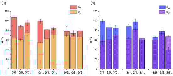 Contact angle measurements of deionized water and diiodomethane were carried out with a Drop Shape Analyzer—DSA100E (Krüss, Hamburg, Germany) by the sessile drop method at room temperature under ambient conditions. Drops of 5 μL of deionized water and 2 μL of diiodomethane were placed at different positions on the surface of the samples and recorded 15 s after the complete deposition of each drop. The results of the contact angles were averaged values of at least three independent films for each of the studied conditions. The measured contact angles of the two liquids were used to calculate the surface tension and components of the samples using the Owens–Wendt–Kaelble (OWK) approach [42,43].