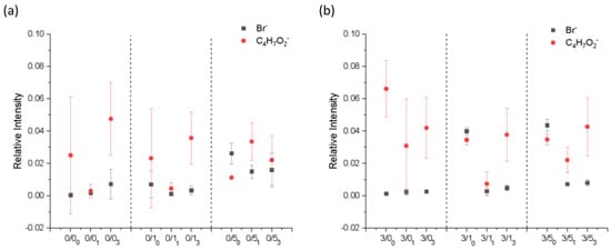 Relative intensities of Br− and C4H7O2− ions as a function of sample type for PLA films after degradation for 1 and 3 months. (a) PLA doped with CTAB; (b) PLA doped with magnesium and CTAB. All data are given as mean and standard deviation.