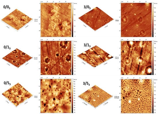 - Previous work [41] has shown that for non-containing-magnesium samples, the degradation after 1 month did not significantly affect the holes formed on the surface of the films when the amount of CTAB was higher than 5% (0/5), but in the case of samples with a lower amount of CTAB (0/1), these holes disappeared. Conversely, the presence of magnesium in the films degraded for 1 month seemed to affect the topography in the case of the high CTAB-content samples: some structures became wider and deeper than in the case of non-degraded film. In the case under study, after 3 months of degradation (Figure 4), the behavior was similar to 1 month: the surface of the films with low amounts of CTAB (0/13 and 3/13) did not show any holes after degradation, regardless of whether the films contained magnesium or not. For the samples with the highest amount of CTAB (0/5 and 3/5), those holes observed on the surface at 1 month degradation were still observed after 3 months of degradation, with the particularity that magnesium made the distribution of the structures more uniform, as we have already mentioned.