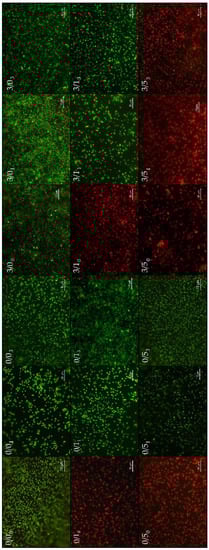 Representative fluorescence microscopy images of every PLA surfaces after bacterial adhesion. In the first row, we find the samples without CTAB from left to right 0/00, 0/01, 0/03, 3/00, 3/01 y 3/00. In the second row, the samples with 1%/w/w), the same from left to right 0/10, 0/11, 0/13, 3/10, 3/11 y 3/13. Then, in the last row are located the samples with 5% (w/w) CTAB from left to right 0/50, 0/51, 0/53, 3/50, 3/51 y 3/53. Green colored bacteria indicate that they are alive, and when bacteria show a red color they are damaged or not dead.