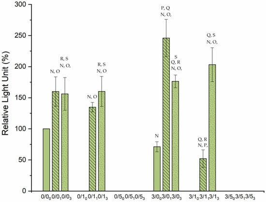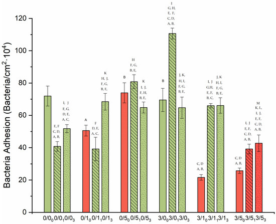 Bacterial density adhered to the surface of the PLA samples. The smooth bars are those given to the non-degraded samples, the diagonally hatched bars are for the samples degraded for one month, and lastly, the notched bars are for the samples degraded for 3 months. Likewise, the color given to each bar represents the viability of the adhered bacteria, green for the viable ones and red for the damaged ones. Statistical difference (p < 0.05) is marked with the different letters depending on which sample it is compared with. The letters A is used to 0/00; B is used to 0/10; C is used to 0/50; D is used to 3/00; E is used to 3/10; F is used to 3/50; G is used to 0/01; H is used to 0/11; I is used to 0/51; J is used to 3/01; K is used to 0/03; L is used to 0/53; M is used to 3/03.