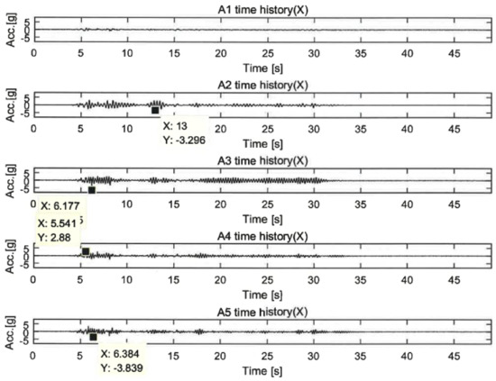 Figure 18 represents the acceleration responses under 100% El Centro excitations. The difference in acceleration between the unreinforced and reinforced specimens can be explained by the action of the control force. It was presumed from the plot that the control forces acted strongly on the specimens from the high reduction in the accelerations. Additional control forces acted on the lower part of the LTMD control specimen other than its upper part, which greatly reduced the vibration responses compared to the GFRPU reinforcement specimen. It can be observed that the acceleration responses of the upper slab were significantly reduced in the order of the GFRPU, LTMD, and hybrid reinforcements. The shear-resisting capacity or control force was increased in this order.