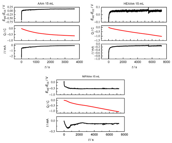 Profiles of EWE-ECE, Q, and I vs. time recorded during the potentiostatic seATRP of 10 wt% AAm, HEAAm, and NIPAAm in H2O +0.1 M NaBr + 0.05 M SP at T = 0 °C. Eapp = Epc. Working electrode = Pt mesh, counter electrode = Al wire. Both WE and CE have ~6 cm2 surface area. V = 15 mL. Substrate is cellulose(H)-BriB.