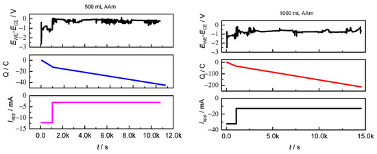 Profiles of EWE-ECE, Q, and Iapp vs. time recorded during the galvanostatic seATRP of 10 wt% AAm in H2O + 0.05 M NaBr + 0.05 M SP at T = 10 °C. V = 500 and 1000 mL, respectively.