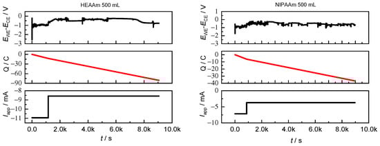 From the electrochemical point of view, the galvanostatic polymerizations were constrained by the scaled Iapp values, allowing the regeneration of [CuIMe6TREN]+ in a simpler electrochemical setup. Profiles of EWE-ECE, Q, and Iapp recorded during large-scale polymerizations are shown in Figure 3 (for Aam at 500 and 1000 mL) and Figure 4 (for HEAAm and NIPAAm at 500 mL):