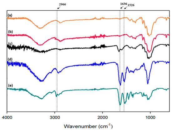 In Figure 5, the hydroxyl group (-OH) stretching vibrations near 3300 cm−1 correspond to both water absorption and cellulose hydroxyl groups [25,28]. After seATRP, the grafted poly(N-alkyl)acrylamides (Figure 5c–e), showed new peaks at 1636 cm−1 and 1526 cm−1 corresponding to the amide I and amide II stretching vibrations. In the case of PNIPAAm, the peak at 2966 cm−1 corresponds to the C–H stretch of the isopropyl group appear [49], thus confirm the successful growth of PNIPAAm on the substrate.