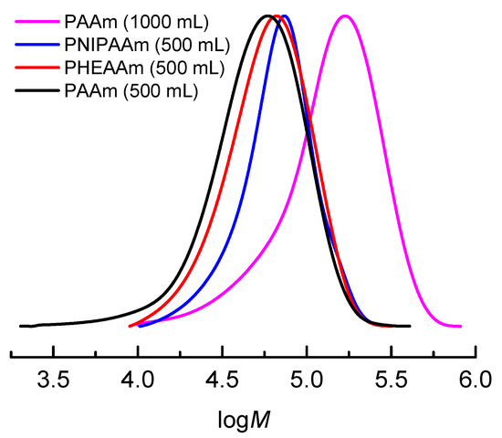GPC chromatograms of poly(N-alkyl)acrylamide-Br cleaved from cellulose surface after the galvanostatic seATRP at 500 mL: PAAm 500 mL (▬), PHEAAm 500 mL (▬), PNIPAAm 500 mL (▬), and PAAm 1000 mL (▬).