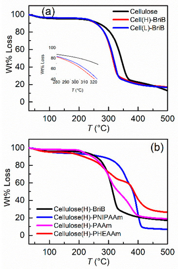 TGA analysis of (a) pristine MCC (▬), cellulose(H)-BriB (▬), and cellulose(L)-BriB (▬); (b) cellulose(H)-BriB before (▬) and after the polymerization of NIPAAm (▬), HEAAm (▬), and AAm (▬).