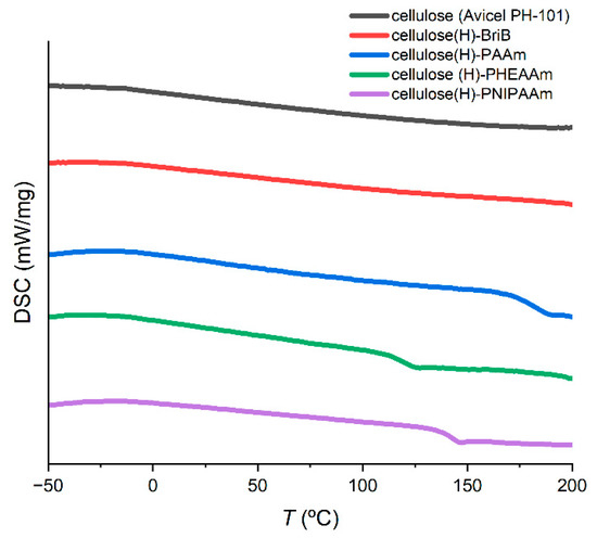 DSC thermograms of MCC (▬), cellulose(H)-BriB (▬), cellulose(H)-PAAm-Br (▬), cellulose(H)-PHEAAm-Br (▬), and cellulose(H)-PNIPAAm-Br (▬) recorded from T = −50 °C to T = 200 °C.
