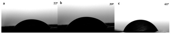 When cellulose(H)-g-PNIPAAm-Br was mixed with 50 wt% cellulose pulp (Figure 10b), the contact angle increased from 22° to 39° compared to the control sample (Figure 10a). When the film was heated to T = 50 °C, the contact angle also increased to 61°, proving the thermoresponsiveness of the resulting film. The value obtained is lower than for the pure cellulose PNIPAAm samples (Figure 9), which was expected due to the higher cellulose content in the final films. This confirms the thermoresponsive behavior of PNIPAAm: at T > LCST, the material becomes more hydrophobic. The behavior of the film can be switched from hydrophilic to hydrophobic by increasing T above LCST [60], and can be manipulated by changing the mass content of the individual components in the film.