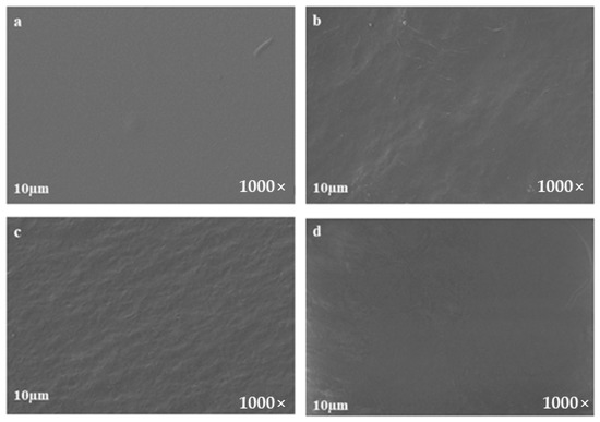To analyze films surface morphology, samples were examined by scanning electron microscopy (SEM). The surfaces were coated with gold and analyzed in a field emission scanning electron microscope (FESEM), ZEISS MERLIN Compact/VPCompact, Gemini II. Thermal stability of films was studied by thermogravimetric analysis (TGA) that was carried out using NETZSCH STA 44F5 (Netzsch, Selb, Germany). Samples were heated in a temperature range of 30 °C to 500 °C at a heating rate of 10 °C/min under nitrogen purge flow. Additionally, thermal behavior was evaluated by differential scanning calorimetry (DSC) performed in a NETZSCH DSC 204 F1 Phoenix model (Netzsch, Selb, Germany). All samples were analyzed in an aluminum pan with an ordinary closed aluminum lid, in a dry nitrogen environment with a purge flow and a heating/cooling rate of 10 °C·min−1. The samples were cooled from room temperature to −60 °C, followed a heating cycle to 250 °C. Then, the samples were cooled again to −50 °C and heated up again to 200 °C. All the values were collected from second heat flux curve.