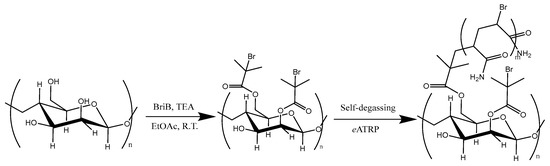 - Garcia-Valdez, O.; Champagne, P.; Cunningham, M.F. Graft modification of natural polysaccharides via reversible deactivation radical polymerization. Prog. Polym. Sci. 2018, 76, 151–173. [Google Scholar] [CrossRef]
