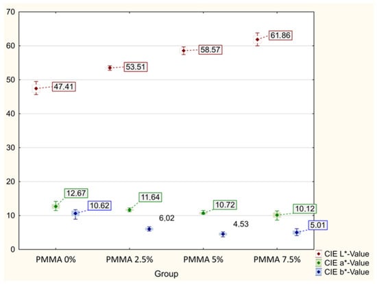 Comparison of mean values in CIE L*a*b* color space of modified and unmodified PMMA.