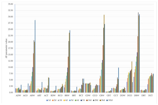 Comparison of mean values of ∆E parameter according to subgroup (immersion solution) and time.