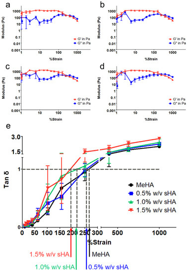 36]. In this study, we adjusted the degree of modification of MeHA into the range of 80–100% in order to minimize the gel onset time. From the results, we could achieve gelation time within a few minutes. Additional sHA seemed to have effects on the gelation time, since the gel time of the formulations containing 1.0 and 1.5%