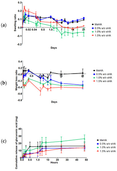 In order to evaluate the long-term retention of incorporated sHA within the MeHA hydrogel, a swelling and degradation study, and in vitro release study should be performed. We found that a high content of sHA increased the gel swelling and degradation ratio. This phenomenon was related to a previous study, which reported that the effect of having HA oligomers in an HA hydrogel could increase the swelling ratio and cause low crosslinking density [