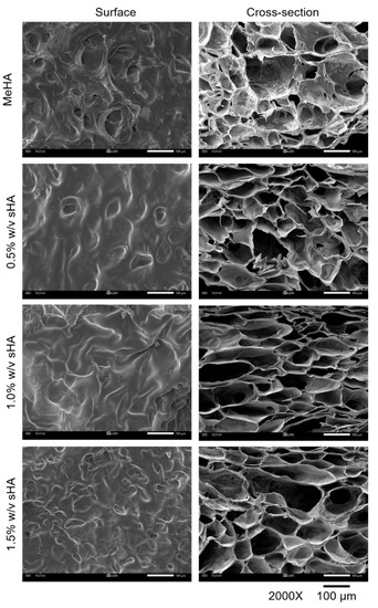 33]. Therefore, a higher content of sHA in a MeHA solution may interfere with the networking system between MeHA macromer chains dissolved in aqueous solutions, resulting in the decrease of viscosity that allowed a faster crosslinking reaction and showed an earlier sol to gel transition. Nonetheless, adding sHA at this range of concentration did not have a significant impact on the gelation time.