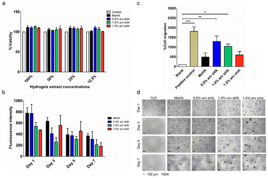 42]. On the contrary, the result of this study showed that the increased amount of sHA resulted in the decrease of migrated cells. The possible reason for this is that the release of sHA from the highest content of sHA hydrogel formulation was hindered by the small pore size of the hydrogels. The microstructure study mentioned above found that the pore size of the gels was reduced as a consequence of an increase in the content of sHA in the network.
