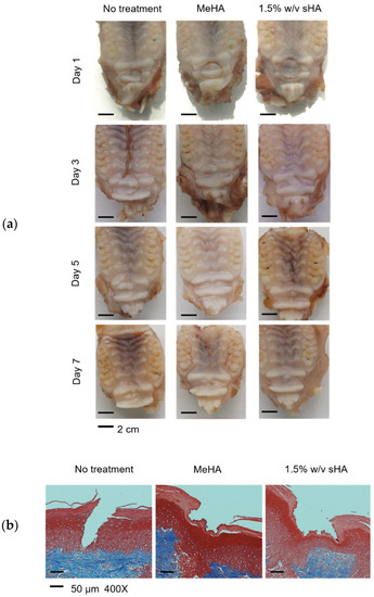 v of sHA appeared to have a prolonged release effect of sHA, it was selected for further study of its impacts on tissue regeneration in an in vivo model, while the base MeHA gel was utilized as a blank. Small defects were simulated on the rats’ upper palates by punching, which damaged the epidermis layers (keratin layer and keratinized stratified squamous epithelium) [